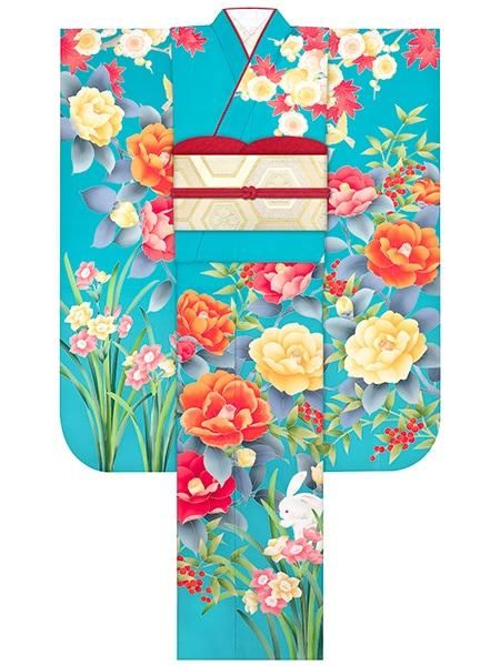 正絹振袖レンタルセット 百花繚乱(ブルー)/帯 花菱亀甲(白金)