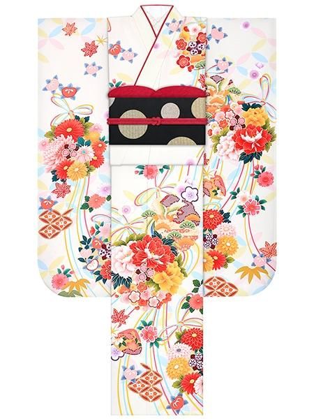 振袖レンタルセット 八咫烏×縞花丸(片身替り/オフ)/帯 七宝(白金)