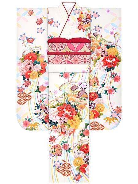 正絹振袖レンタルセット アンティークローズ(オフ)/帯 七宝(白金)