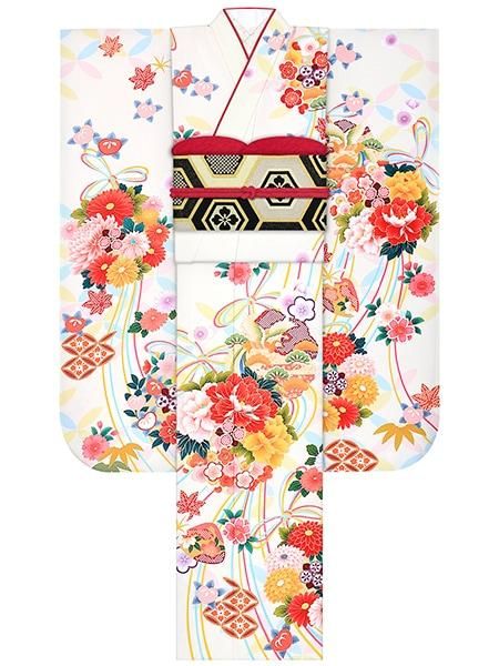 F5710 オフ色×軍鶏牡丹柄の正絹振袖単品