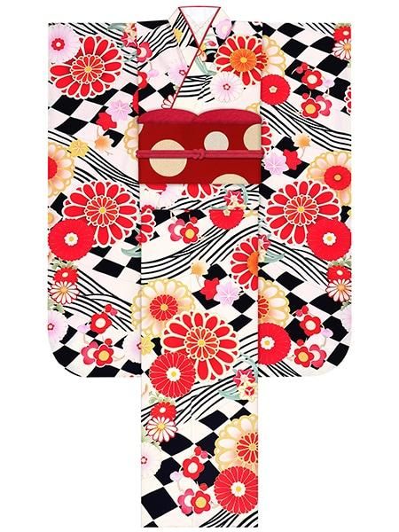 振袖レンタルセット フラッグ菊(黒)/帯 矢羽根(赤)