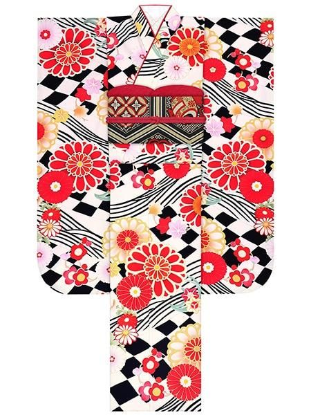 振袖レンタルセット フラッグ菊(黒)/帯 花菱亀甲(黒)
