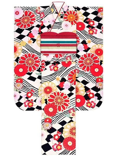 振袖レンタルセット フラッグ菊(黒)/帯 花菱亀甲(白金)