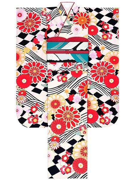 振袖レンタルセット フラッグ菊(黒)/帯 矢羽根(ターコイズ)