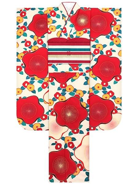 振袖レンタルセット つばき刺繍(グレー)/帯 亀甲(赤)