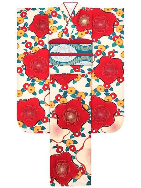 振袖レンタルセット つばき家紋(オフ)/帯 おしどり(白銀)