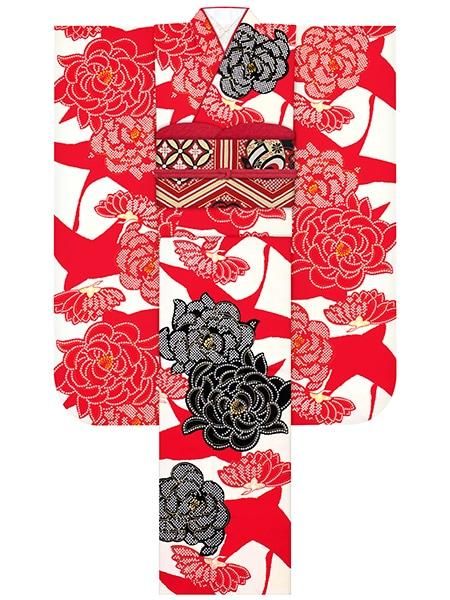 振袖レンタルセット 疋田椿(赤)/帯 ドット(黒)