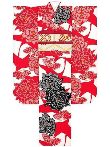 振袖レンタルセット 疋田椿(赤)/帯 更紗(オフ)
