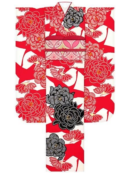 振袖レンタルセット 大梅に椿(赤)/帯 七宝(ピンク)
