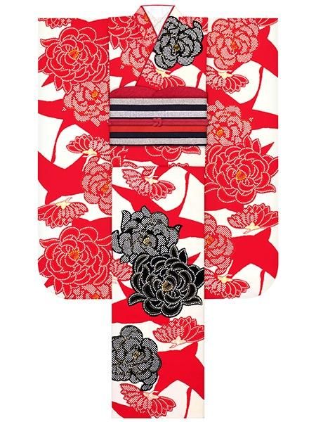 振袖レンタルセット アネモネブーケ(黒)/帯 おしどり(赤)