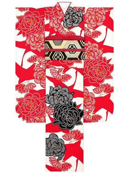 振袖レンタルセット 乙女椿(オフ)/帯 ドット(赤)