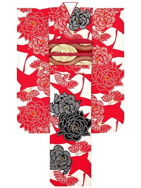 振袖レンタルセット 鶴と牡丹(黒)/帯 ドット(黒)