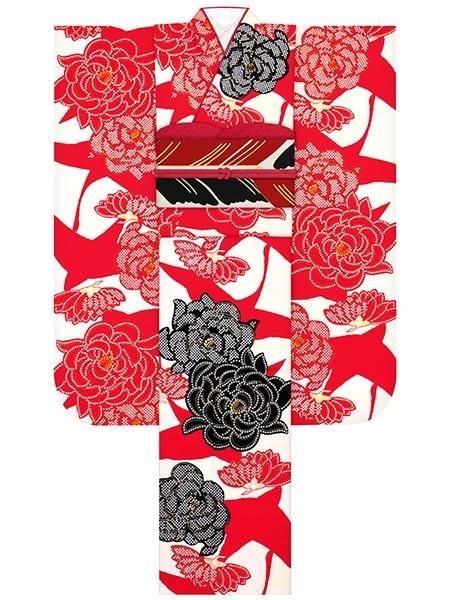振袖レンタルセット シルエット鶴(片身替り/白黒)/帯 亀甲(赤)