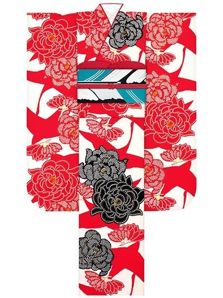 振袖レンタルセット 疋田乱菊(赤)/帯 亀甲(黒)