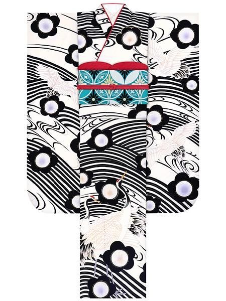 振袖レンタルセット シルエット鶴(片身替り/白黒)/帯 花菱亀甲(白金)