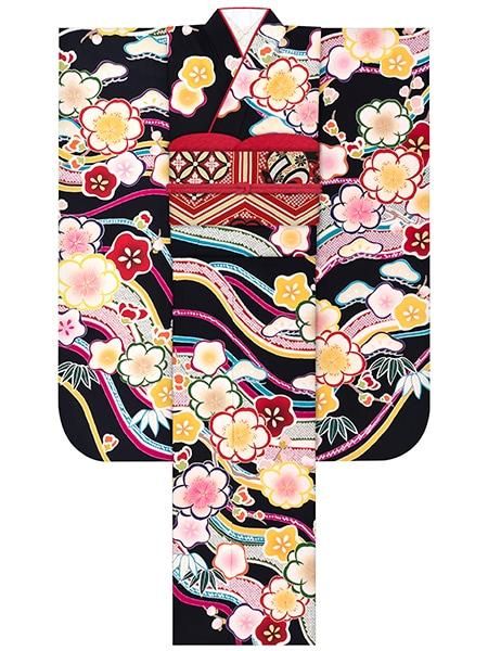 振袖レンタルセット フラッグ菊(黒)/帯 おしどり(黒)
