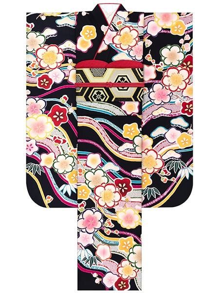 振袖レンタルセット 光琳梅(黒)/帯 七宝(ターコイズ)