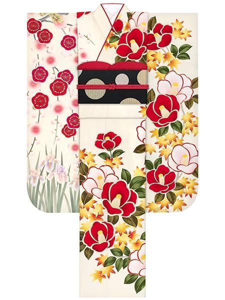 振袖レンタルセット 梅と椿と楓(オフ)/帯 ドット(黒)