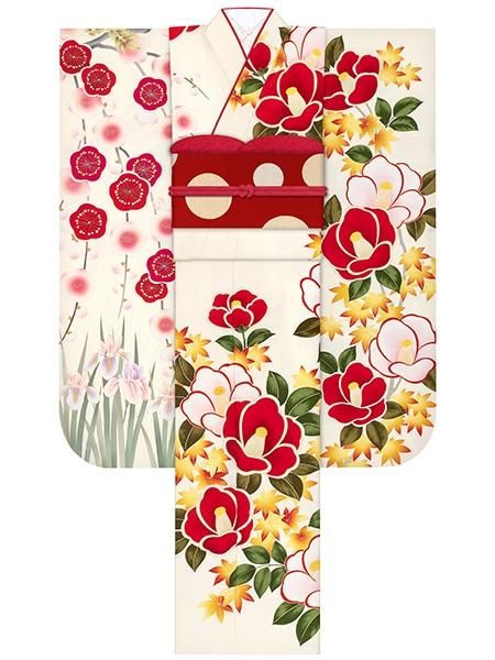 振袖レンタルセット レトロ椿(アイボリー)/帯 七宝(ターコイズ)