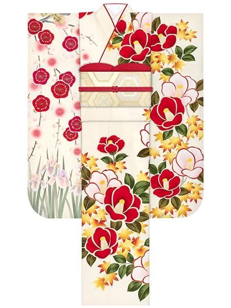 振袖レンタルセット 乙女椿(オフ)/帯 花菱亀甲(白金)