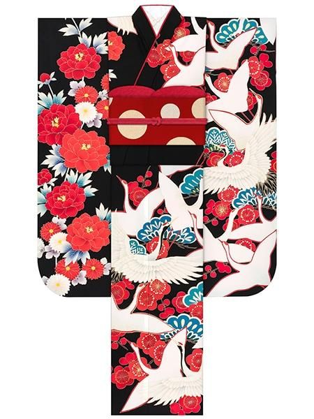 振袖レンタルセット シルエット鶴(片身替り/白黒)/帯 更紗(オフ)