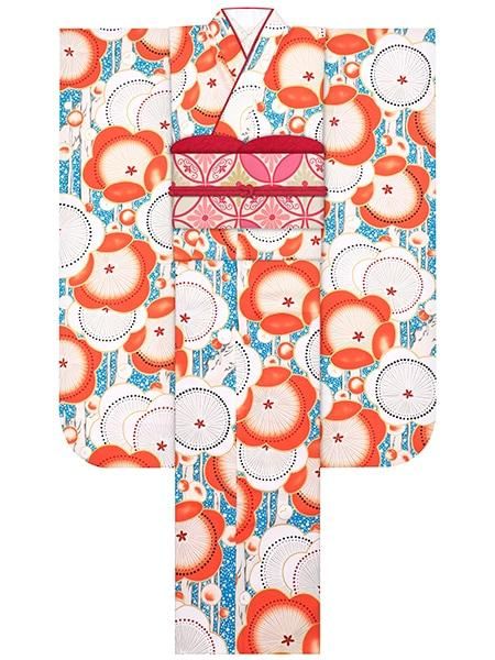 振袖レンタルセット 八咫烏×縞花丸(片身替り/オフ)/帯 七宝(ターコイズ)