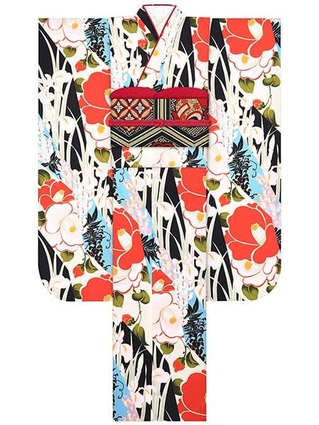 振袖レンタルセット 椿(黒)/帯 七宝(ターコイズ)