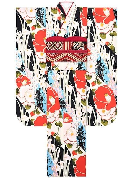 振袖レンタルセット ウロコ(片身替り/黒)/帯 おしどり(赤)