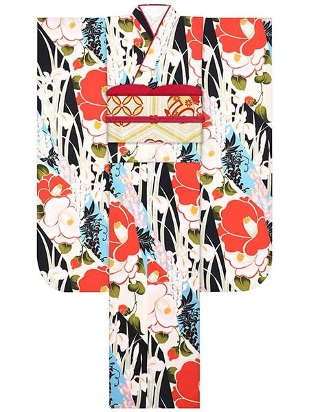 振袖レンタルセット 大梅に椿(赤)/帯 更紗(黒)