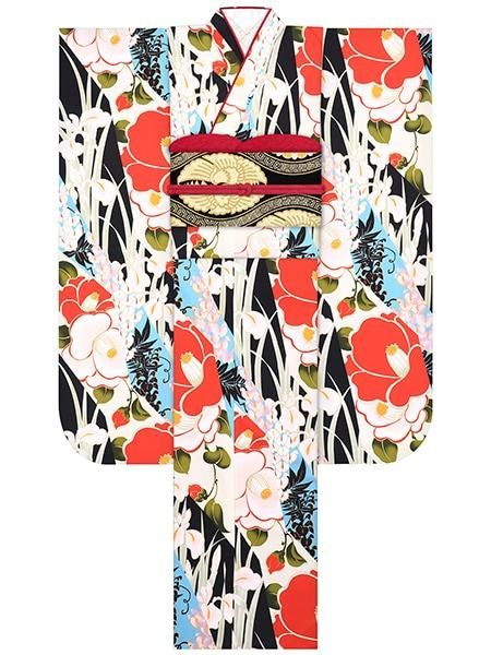 振袖レンタルセット 梅と椿と楓(オフ)/帯 おしどり(赤)
