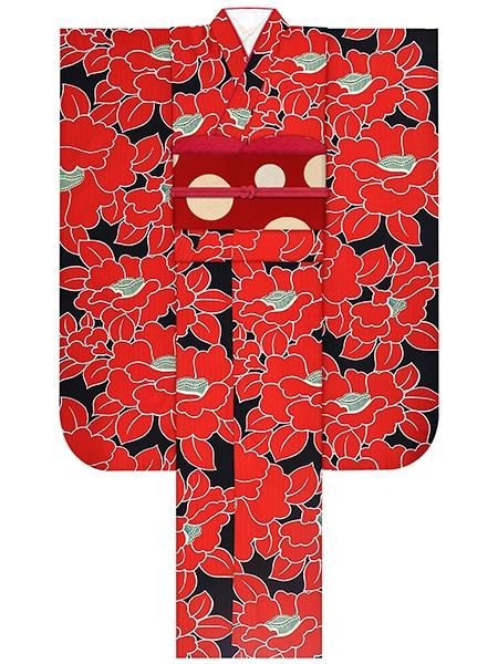 振袖レンタルセット 光琳梅(黒)/帯 縞(オフ)