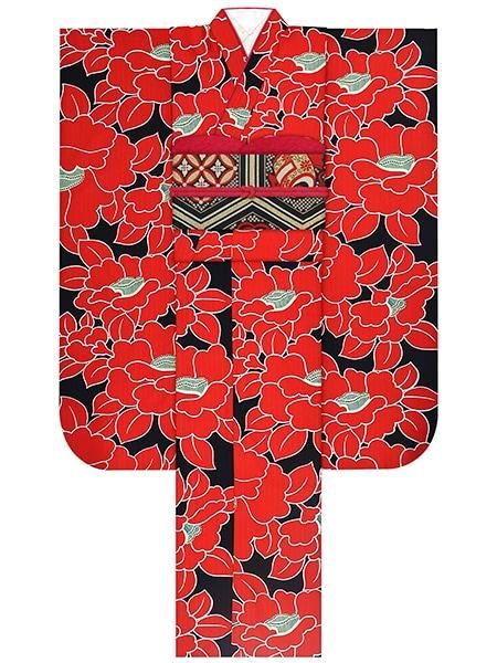 振袖レンタルセット 椿(黒)/帯 亀甲(黒)