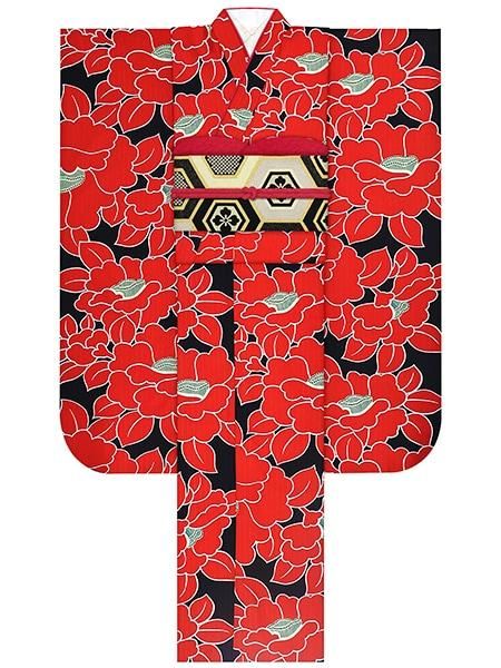 振袖レンタルセット 大梅に椿(赤)/帯 更紗(黒)