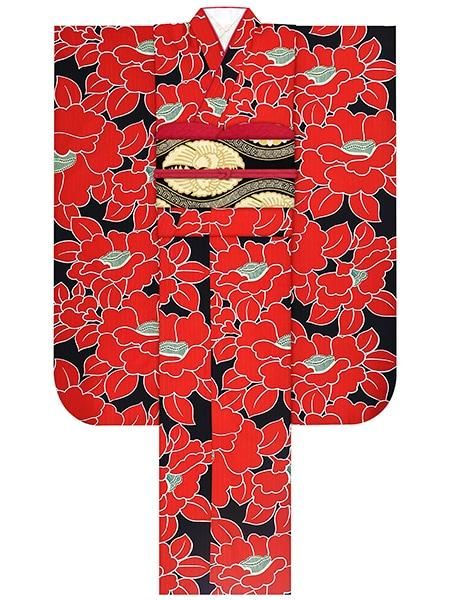 振袖レンタルセット 鶴と牡丹(黒)/帯 亀甲(オフ)