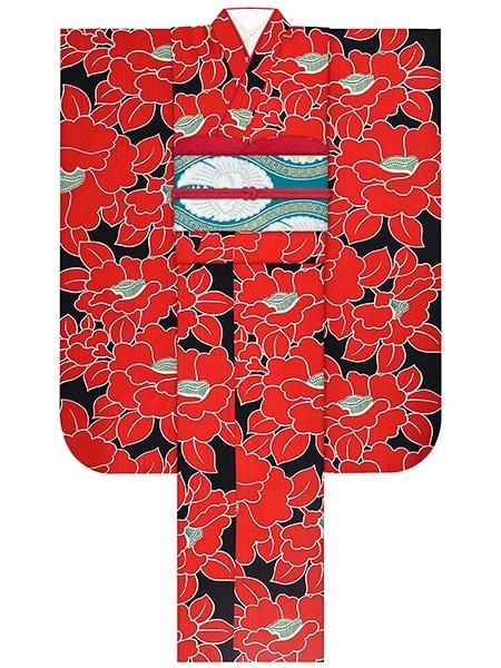 振袖レンタルセット 椿(黒)/帯 おしどり(ターコイズ)