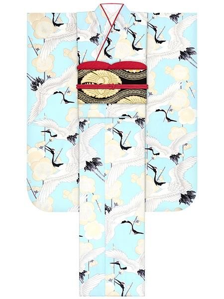 振袖レンタルセット 梅鶴(水色)/帯 縞(オフ)