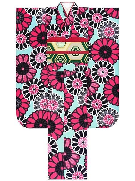 振袖レンタルセット フラッグ菊(黒)/帯 花菱亀甲(白金)