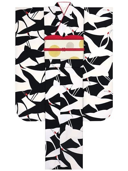 振袖レンタルセット シルエット鶴(片身替り/白黒)/帯 ドット(オフ)