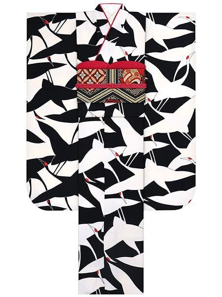 振袖レンタルセット シルエット鶴(片身替り/白黒)/帯 亀甲(オフ)
