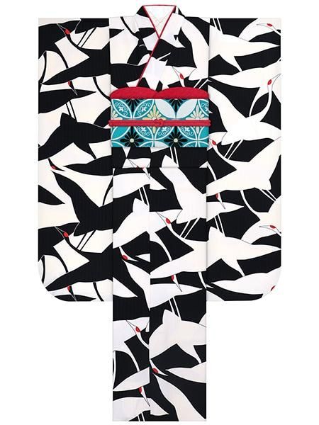 振袖レンタルセット 八咫烏×縞花丸(片身替り/オフ)/帯 おしどり(ターコイズ)