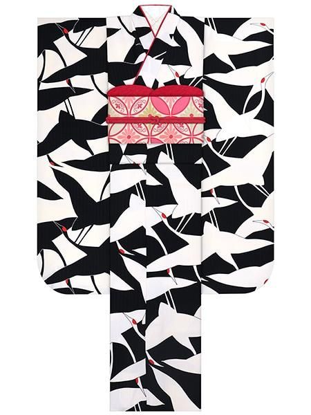 振袖レンタルセット シルエット鶴(片身替り/白黒)/帯 矢羽根(赤)