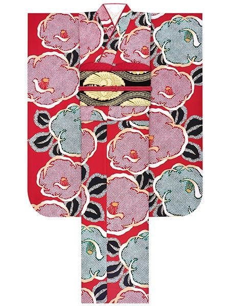 振袖レンタルセット 大梅に椿(赤)/帯 矢羽根(ターコイズ)