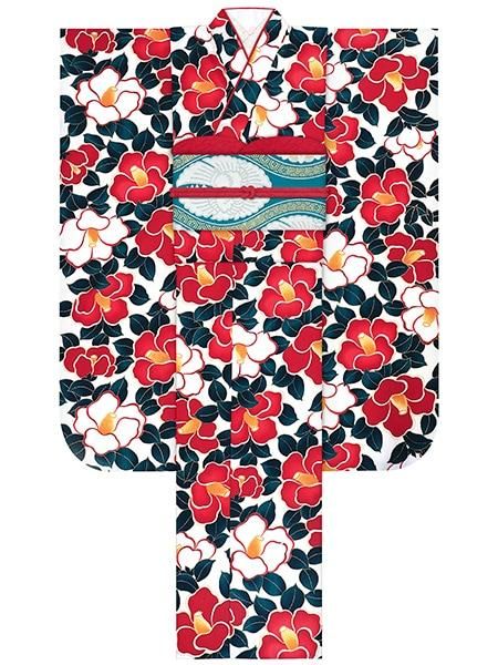 振袖レンタルセット レトロ椿(アイボリー)/帯 おしどり(ターコイズ)