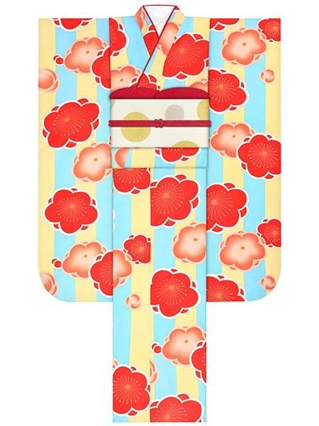 振袖レンタルセット 縞に梅(黄)/帯 ドット(オフ)