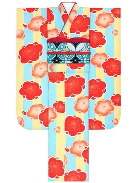 振袖レンタルセット 縞に万寿菊(黒)/帯 矢羽根(ターコイズ)