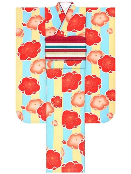正絹振袖レンタルセット 銘仙花(イエロー)/帯 七宝(ターコイズ)