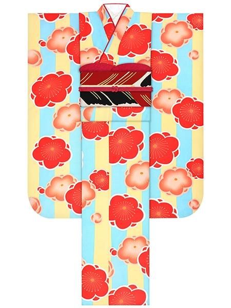 振袖レンタルセット 縞に梅(黄)/帯 矢羽根(赤)