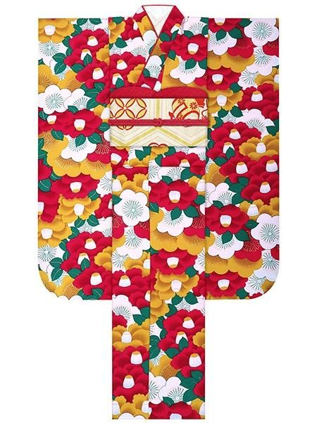 振袖レンタルセット 疋田椿(赤)/帯 おしどり(ターコイズ)