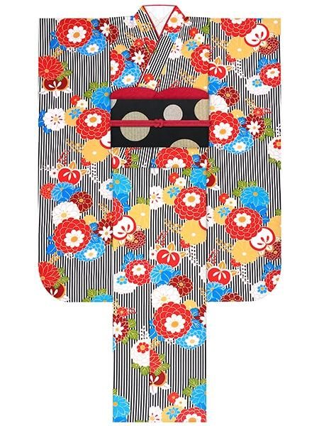 振袖レンタルセット 縞に万寿菊(黒)/帯 七宝(ピンク)