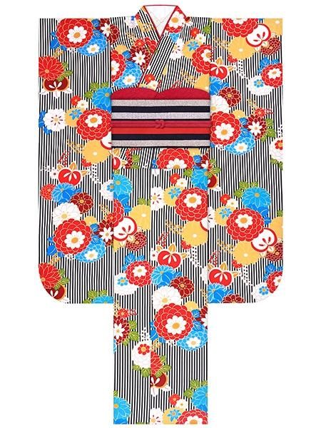 振袖レンタルセット 縞に万寿菊(黒)/帯 おしどり(赤)